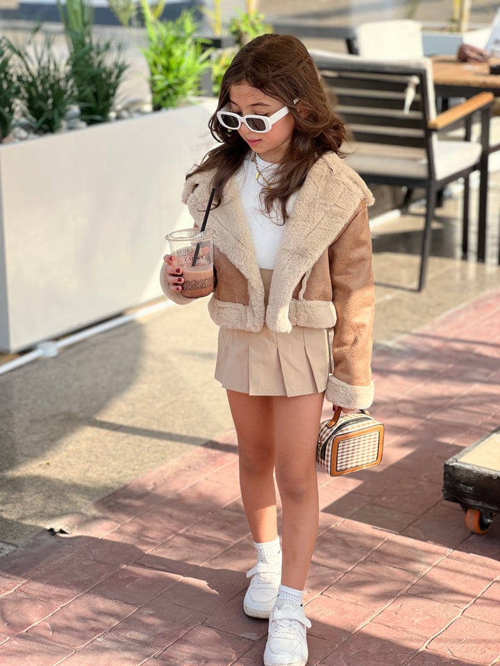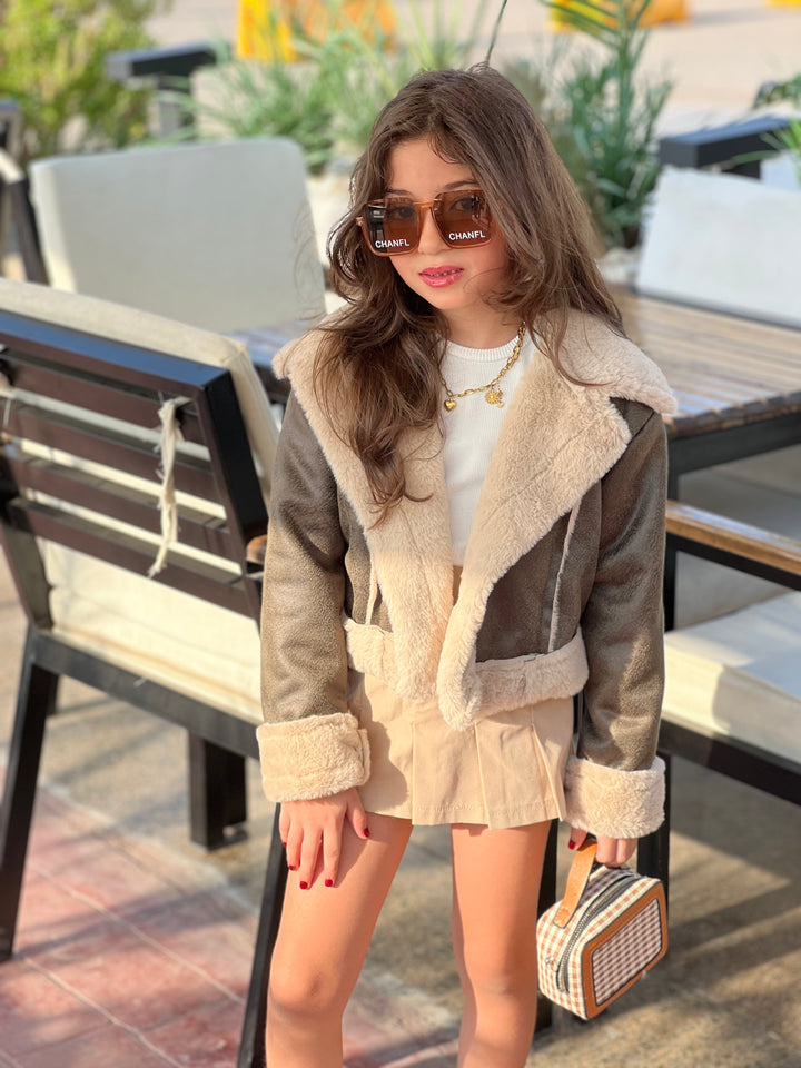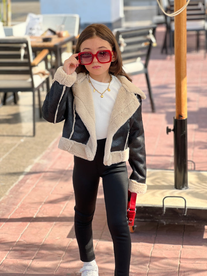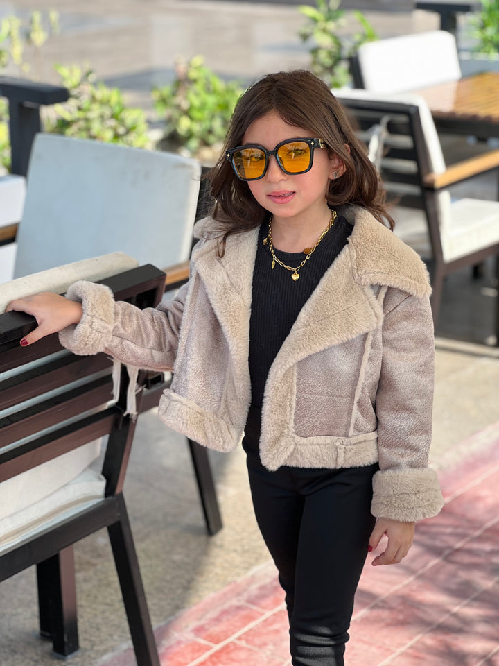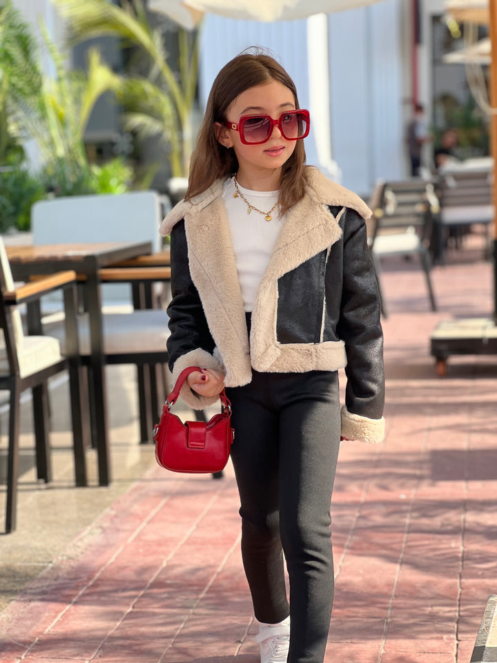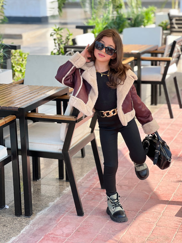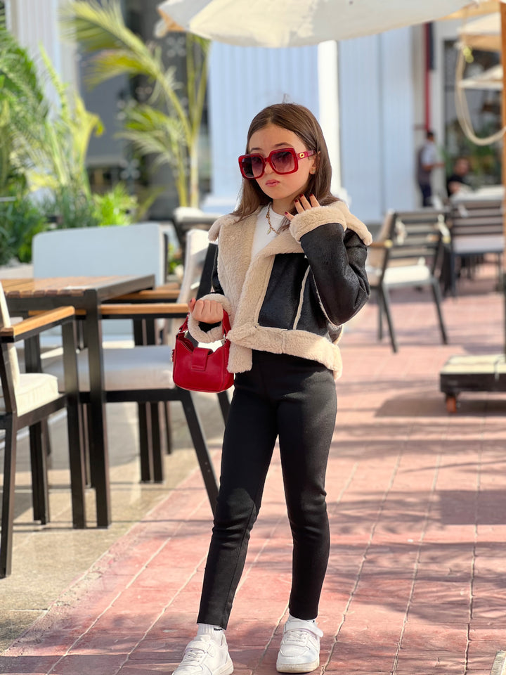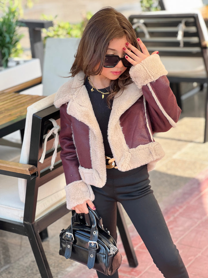 جاكيت قصير أنيق بخامة مميزة من الخارج، مزيج بين الجلد والشمواه بلمعة راقية وملمس عصري