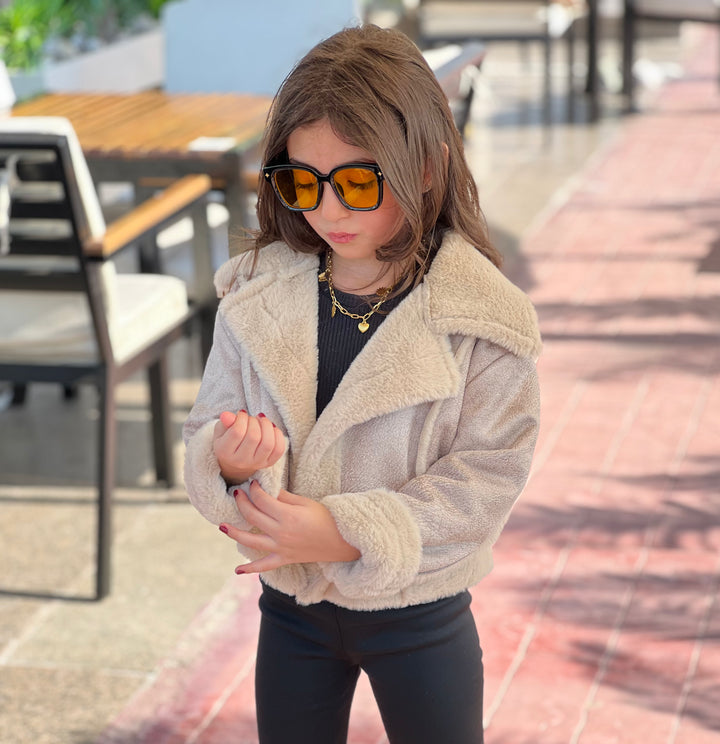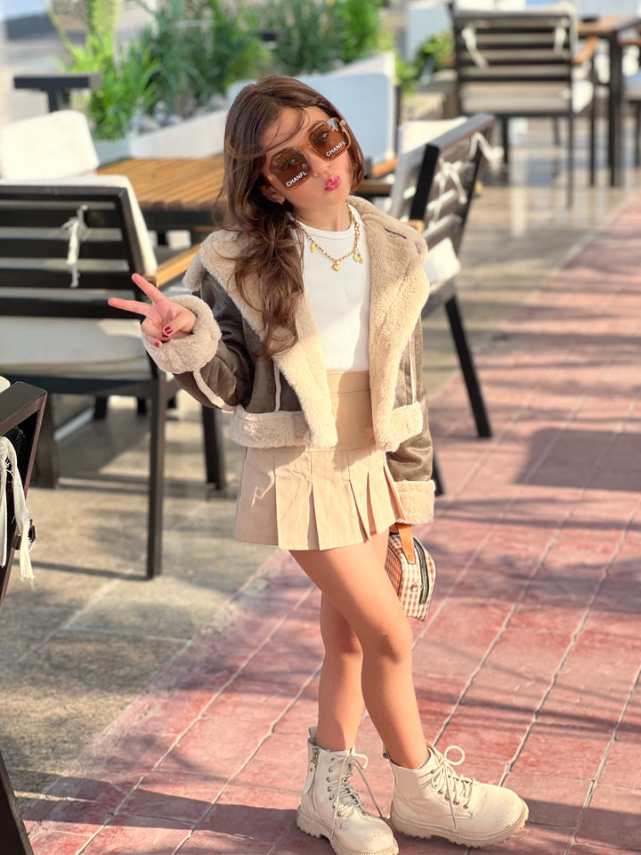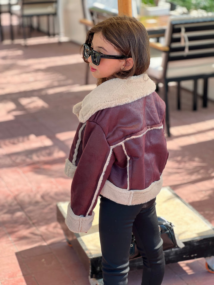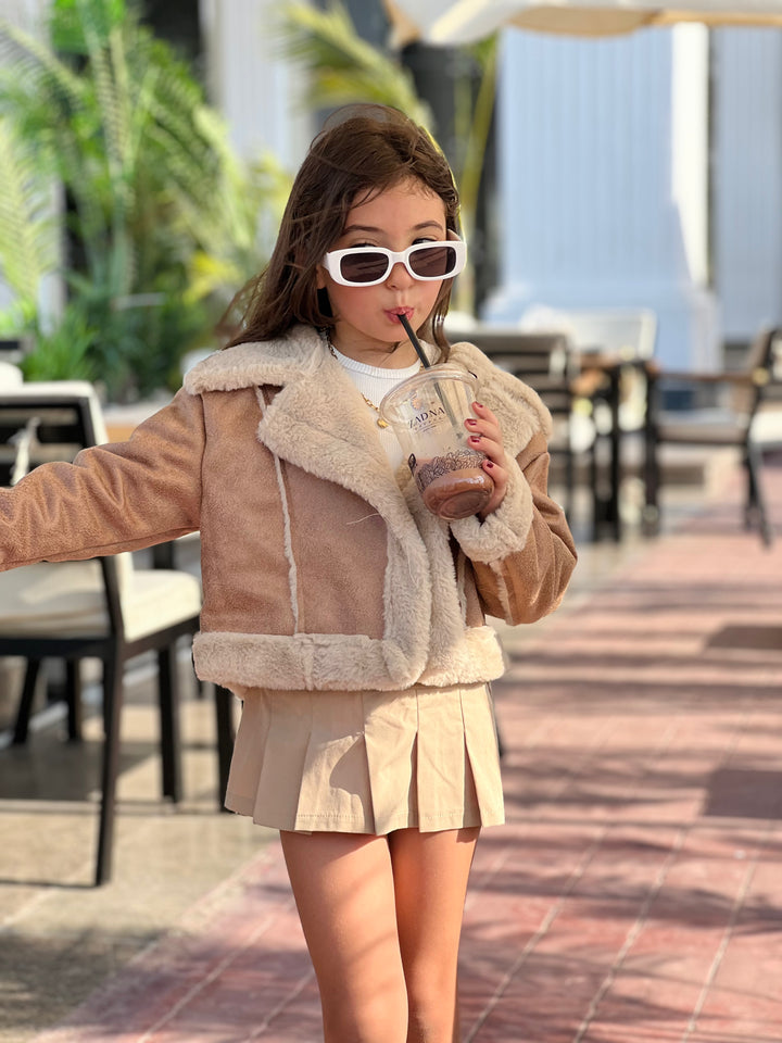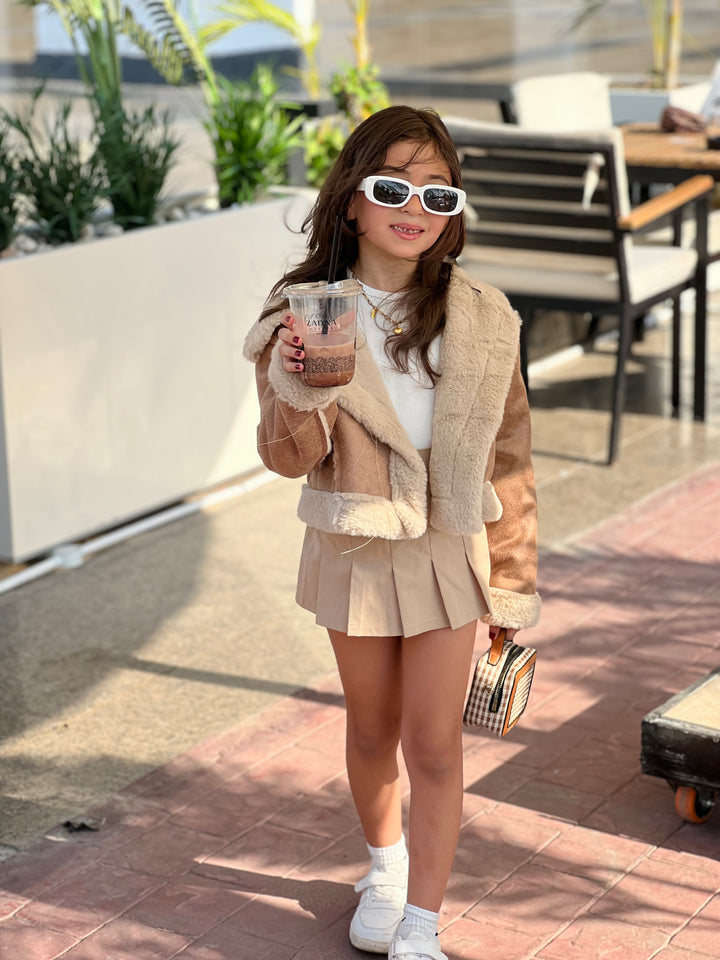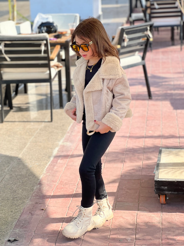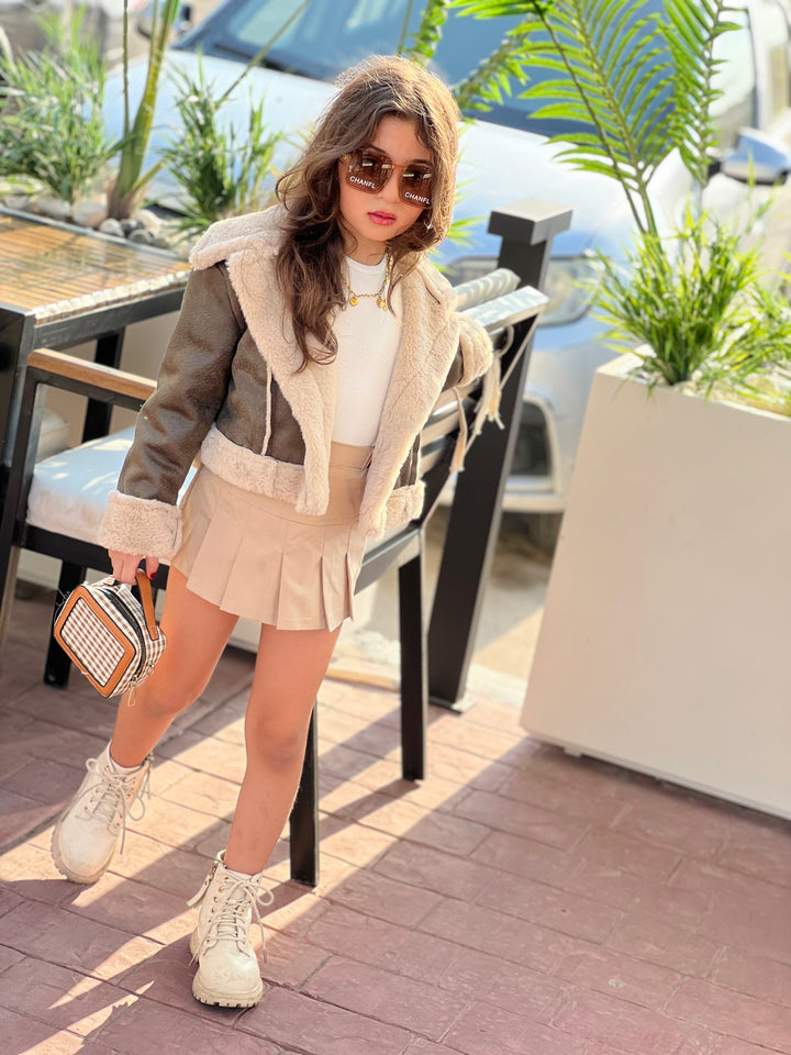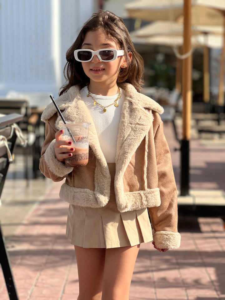 جاكيت قصير أنيق بخامة مميزة من الخارج، مزيج بين الجلد والشمواه بلمعة راقية وملمس عصري