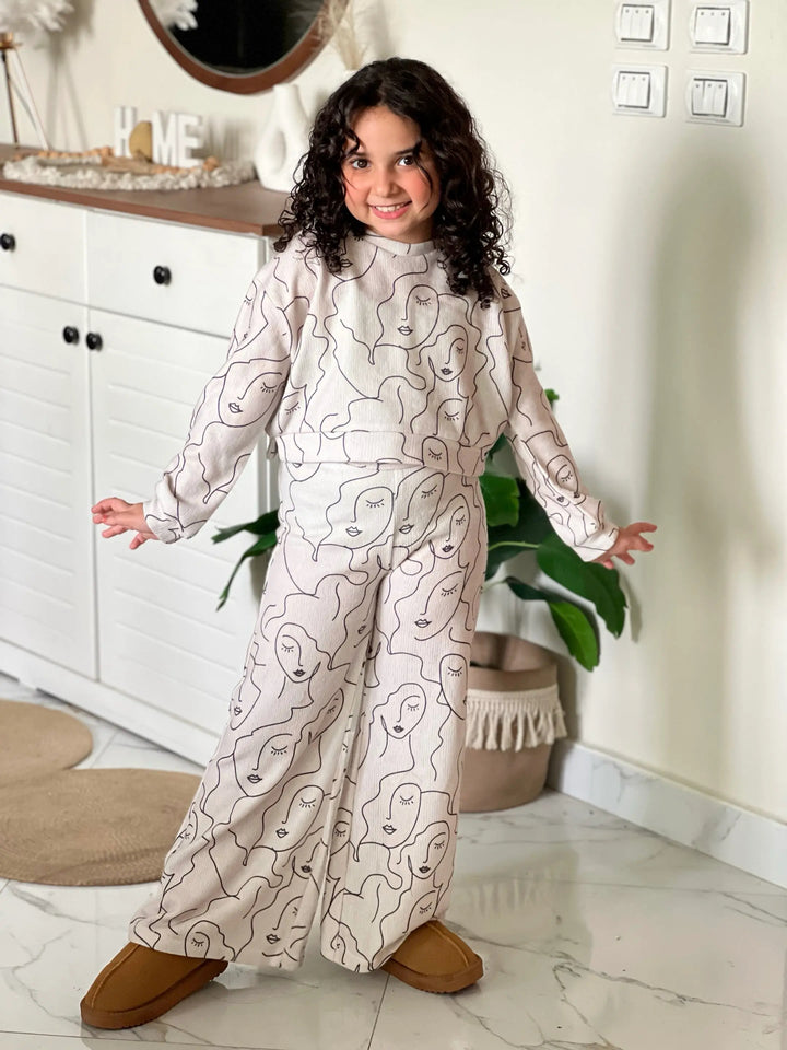 سوت شتوي مطبوع بتقنية Sublimation المميزة، مكوّن من قطعتين (توب + بنطلون وايد ليج) بخامة ريب شتوي دافئة تمنح راحة وأناقة في نفس الوقت