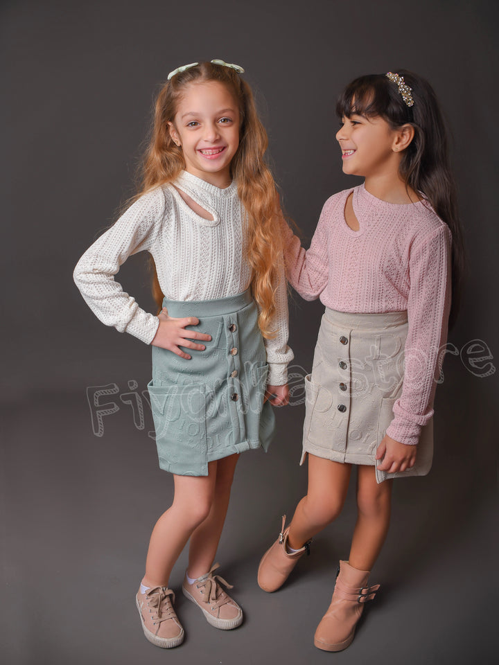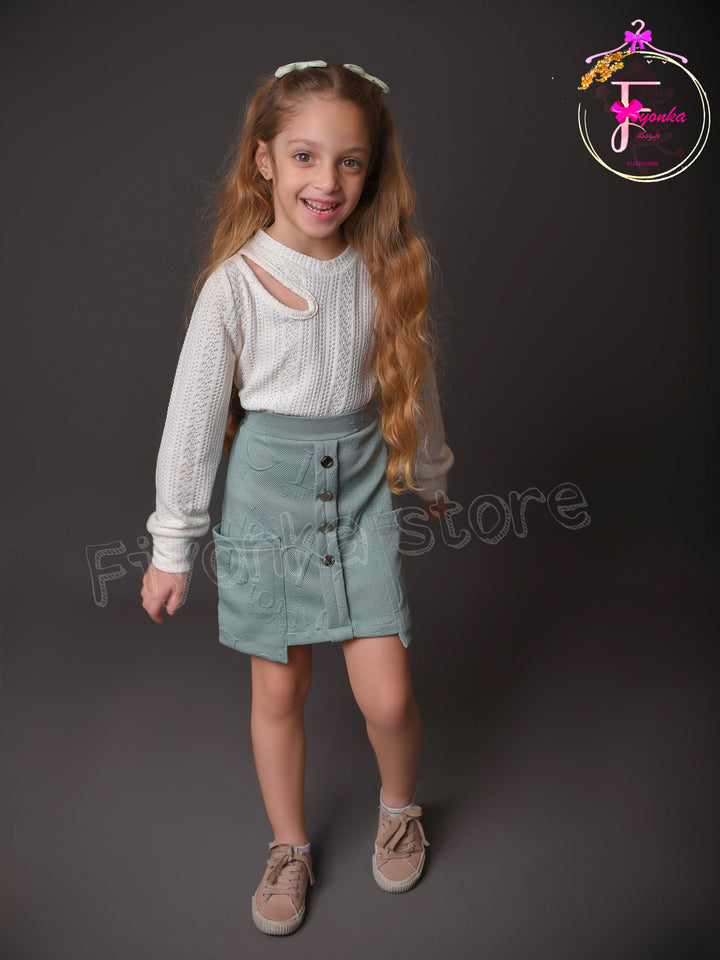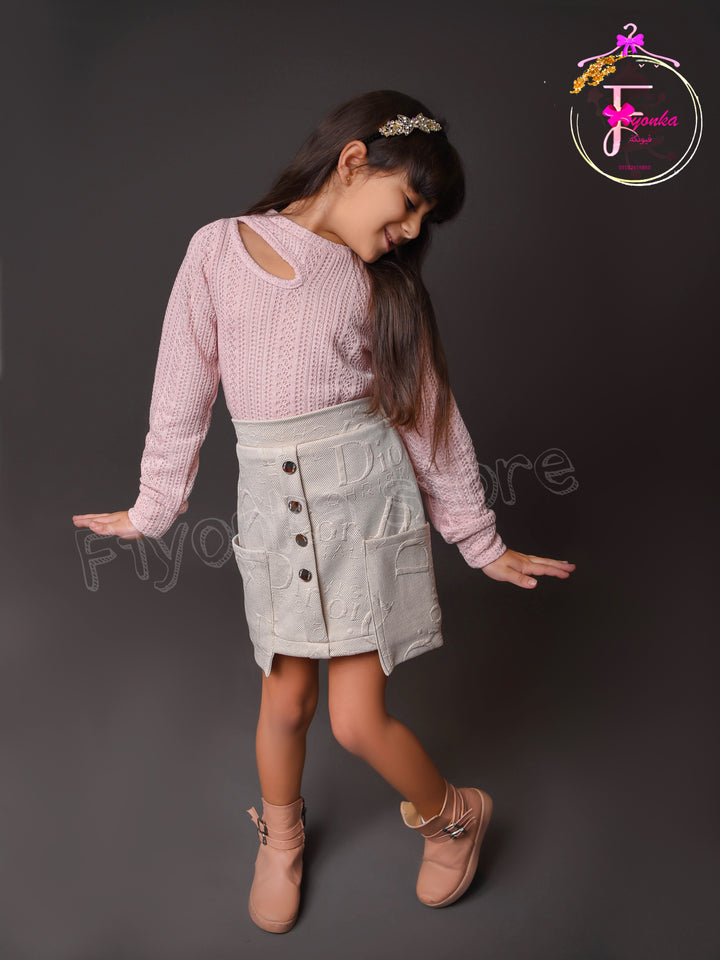طقم بناتي قطعتين شتوي مكوّن من بلوزة صوف تركي ناعمة وسكيرت ديور أنيقة مزوّدة بجيوب
