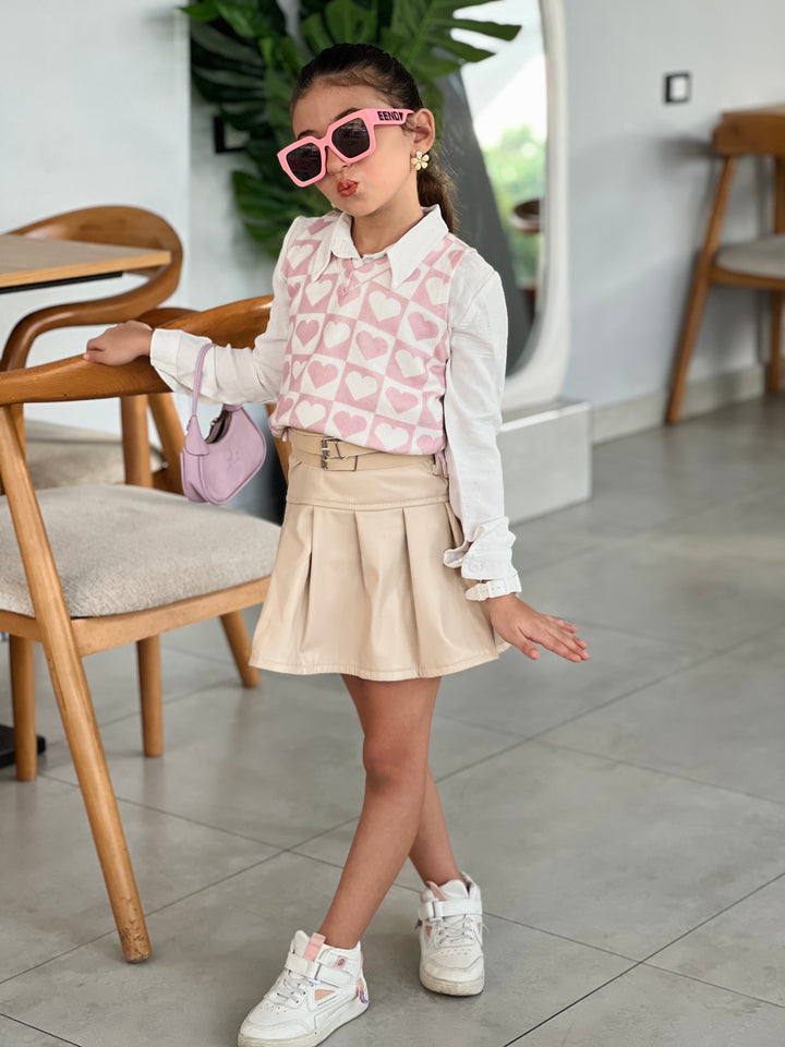 سكيرت جلد منفوشة مبطنة قطيفة من الداخل عشان تدي دفاية وراحة، ومعاها حزامين متغيرين يدو حرية في تغيير الستايل.